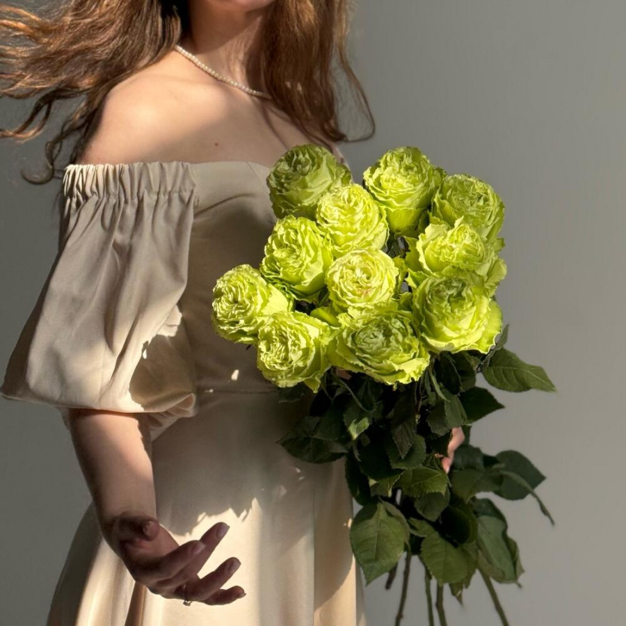 На фото букет из 11 зеленых роз. В составе: пионовидная роза 11 шт, атласная лента 1 шт, . Все цветы свежие и ароматные, букет красиво оформлен и отлично подходит для подарка. Доступна доставка цветов или самовывоз.