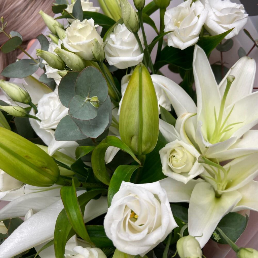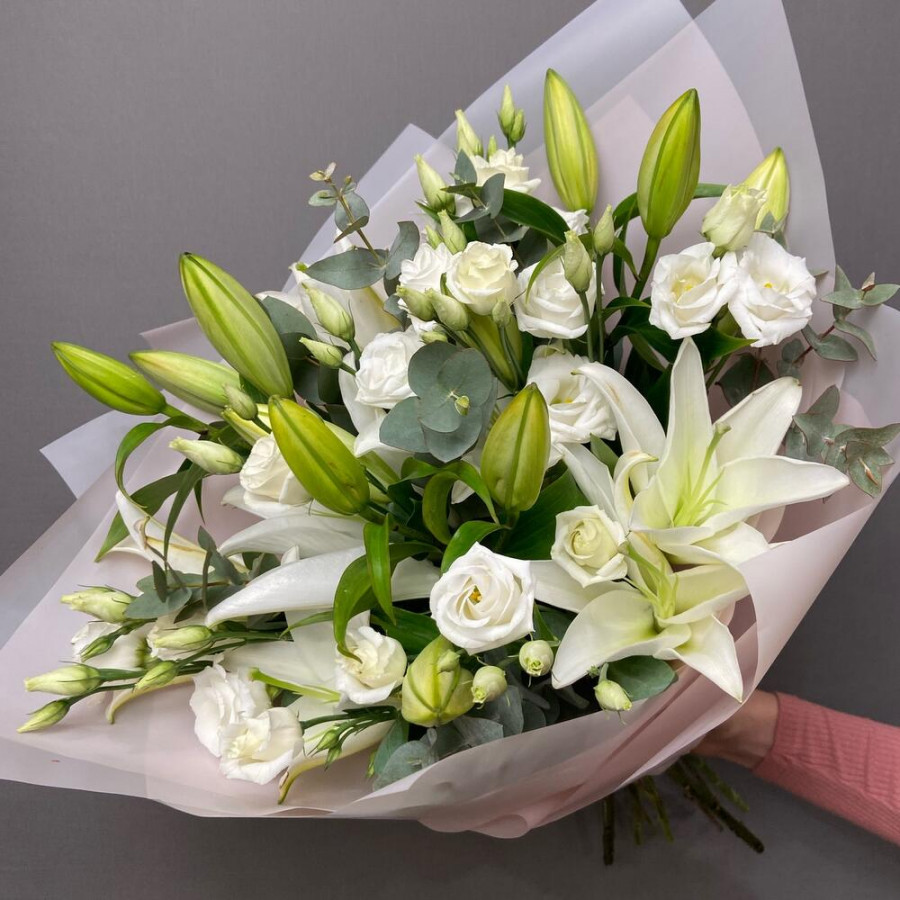 На фото букет «чистое сияние». В составе: лилия 3 шт, эустома (лизиантус) 4 шт, эвкалипт 3 шт, дизайнерская упаковка 1 шт, атласная лента 1 шт, . Все цветы свежие и ароматные, букет красиво оформлен и отлично подходит для подарка. Доступна доставка цветов или самовывоз.
